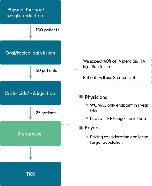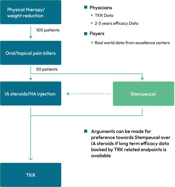 Stempeucel® is approved by CDSCO (Indian FDA equivalent) for treatment of (1) Grade 2 & 3 Osteoarthritis of the knee in non-obese patients with BMI 30Kg m² (2) No-option CLI due to Bruegers Disease & Artherosclerotic Peripheral Arterial Disease